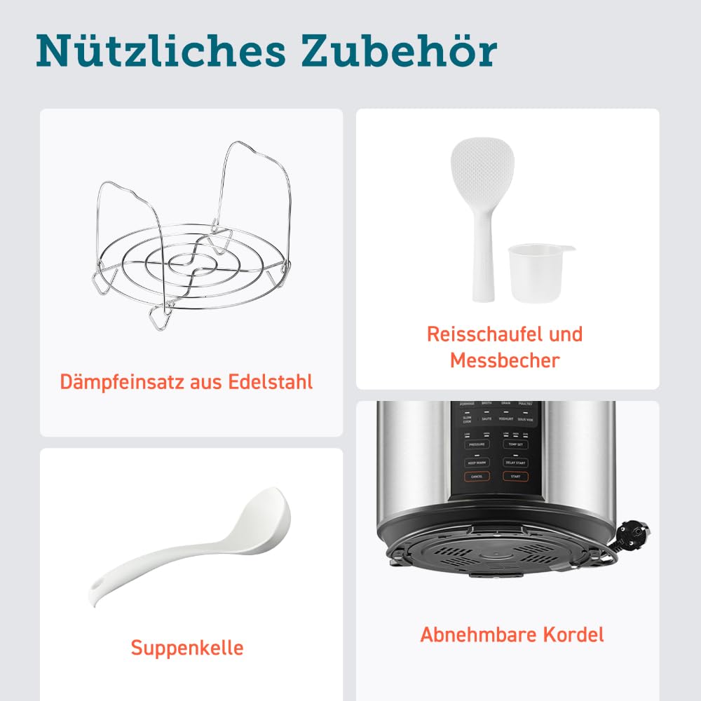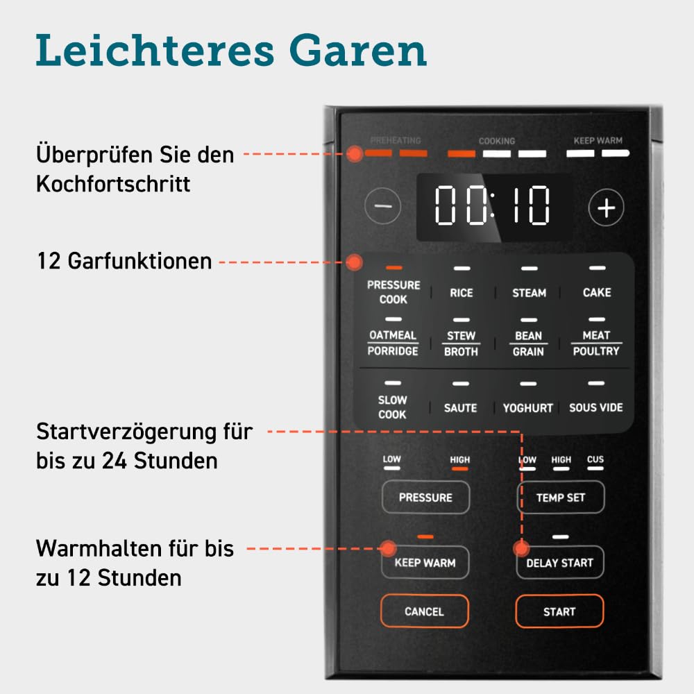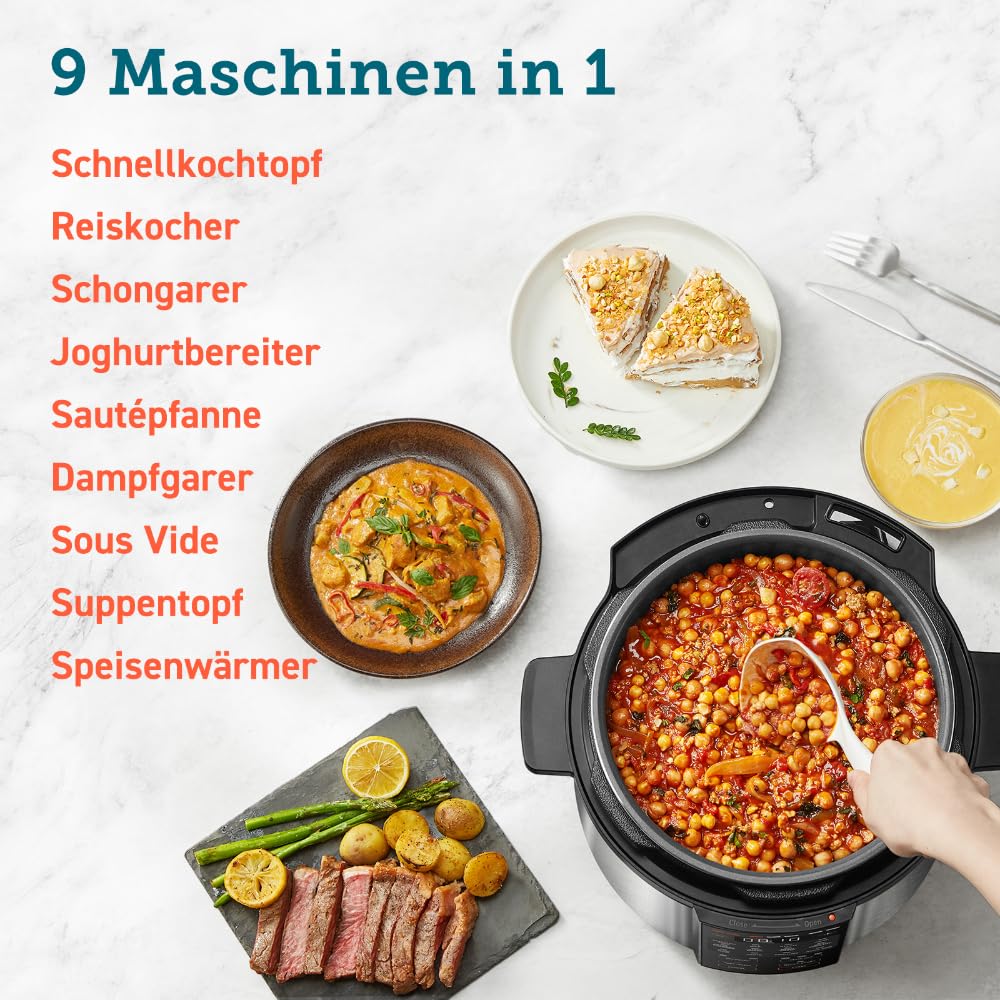 Mit 9 vielseitigen Funktionen ersetzt dieser Multikocher mehrere Küchengeräte: Schnellkochtopf, Reiskocher, Dampfgarer, Slow Cooker, Joghurtbereiter, Sous Vide, Schmortopf, Pfanne zum Anbraten sowie Warmhaltefunktion. Die 14 intelligenten Programme ermöglichen eine einfache, präzise und zeitsparende Zubereitung verschiedenster Gerichte.