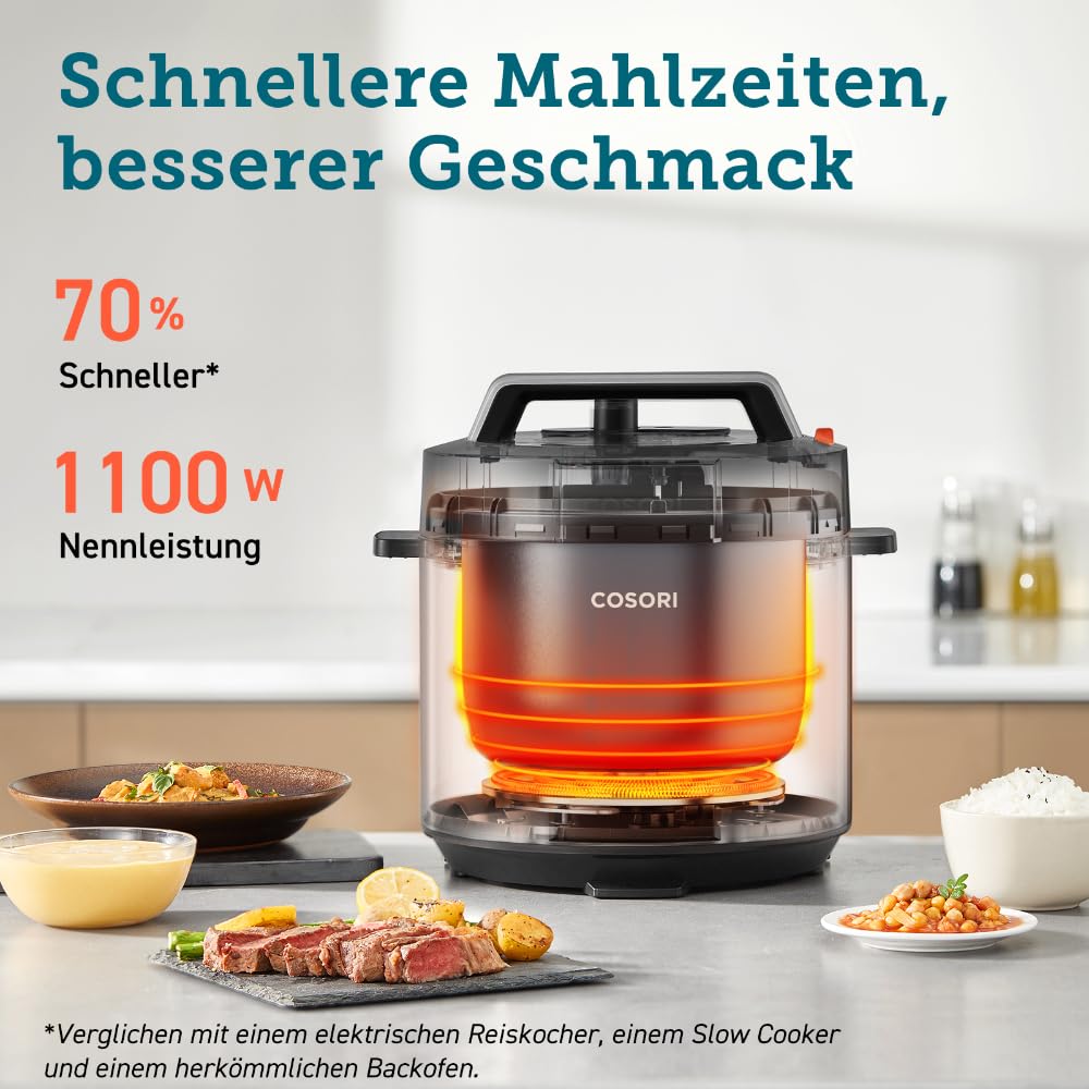 Durch die Schnellkoch-Technologie bereitet der COSORI Pressure Cooker Speisen bis zu 70 % schneller zu als herkömmliche Methoden. Druck, Temperatur, Zeit und Hitze lassen sich individuell einstellen – ideal für Suppen, Eintöpfe, Reisgerichte, Fleisch, Gemüse oder Joghurt.