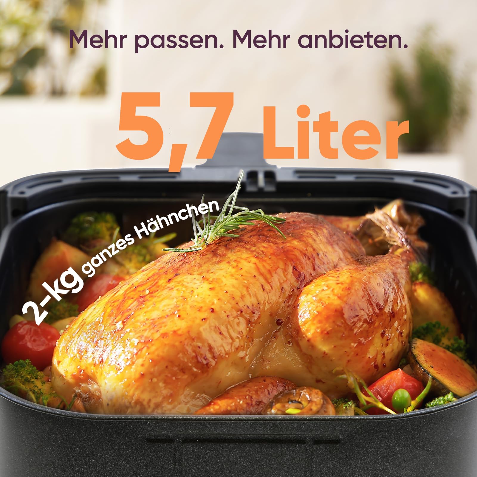 Mit einem großzügigen Fassungsvermögen von 5,7 Litern eignet sich die COSORI CP158-AF ideal für Familien mit 3 bis 5 Personen. Die starke Leistung von 1700 Watt sorgt für schnelle, gleichmäßige Garergebnisse bei Fleisch, Gemüse, Snacks und Backwaren.